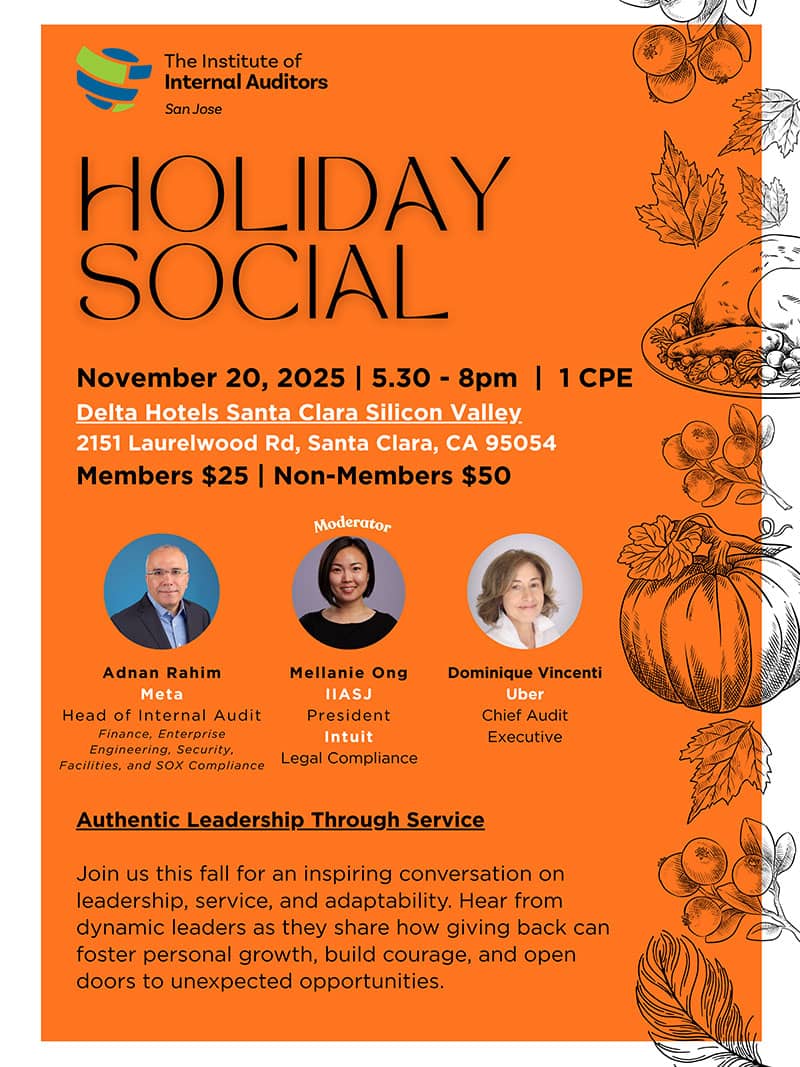 The IIA San Jose Chapter is the vibrant hub for internal auditors, accountants, and other professionals in the San Jose and Silicon Valley area, united by an interest in governance, risk, and control. Established in 1963, our nearly 800-member strong community provides a dynamic platform for advocating the profession, fostering invaluable networking, delivering timely industry updates, and offering essential Continuing Professional Education (CPE).